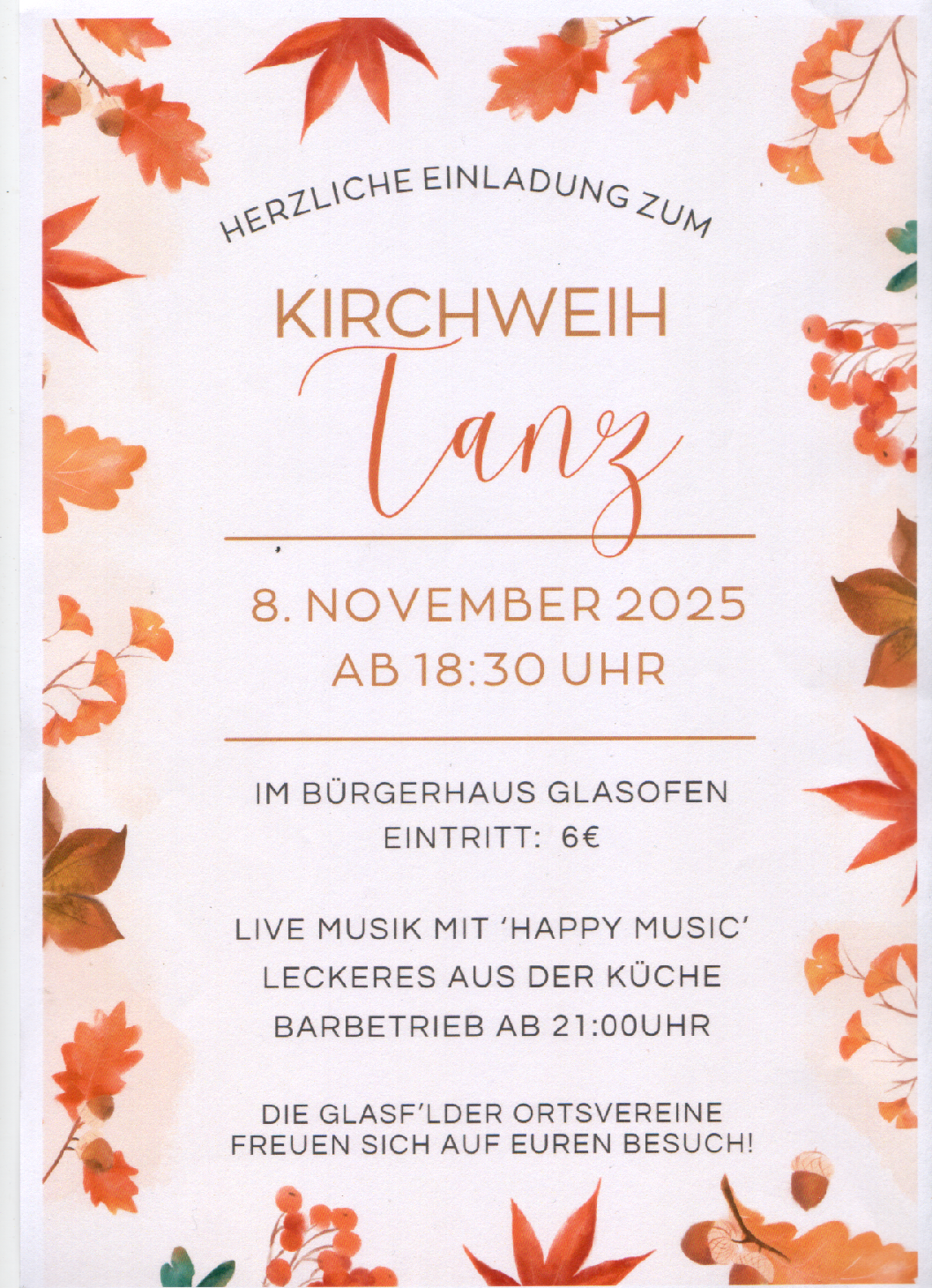 Vereinen. Am 4.11.2023 - luden die Glasofener Ortsvereine zum Kirchweihtanz |